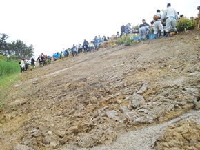 何もなかった斜面が時間をかけて育ち、防潮堤となっていきます。 |