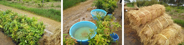 苗に水をつけて植え、その上からわらを敷きます。 |