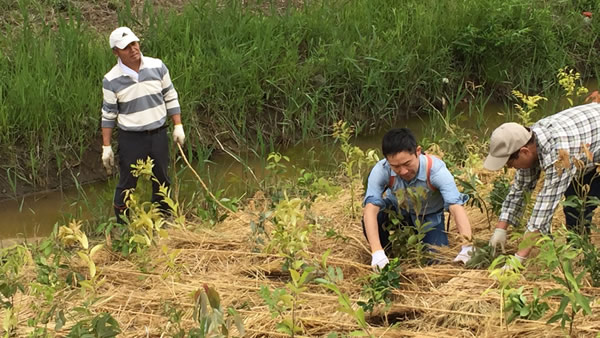 右に見えるのが前回植えた苗木たちです。少しずつ大きく育っています。 |