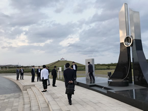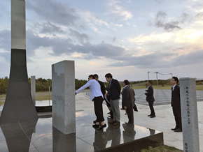 意見交換会の後、被災地見学へお連れし、沿岸部などを経由した後、「千年希望の丘」を訪問。 現在は震災遺構となっている私の実家の蔵と、相野釜公園の慰霊碑へとお連れしました。 |