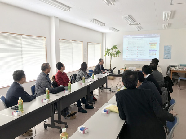 | 当日は、皆さん大阪の伊丹空港から、空路にて仙台空港へ、岩沼市内で昼食を取られたあと、弊社へご来社。 まず始めに、自己紹介を兼ねて当社ホームページをご覧いただき、弊社の紹介をさせていただいたあと、震災に関するDVDを視聴いただきました。 |