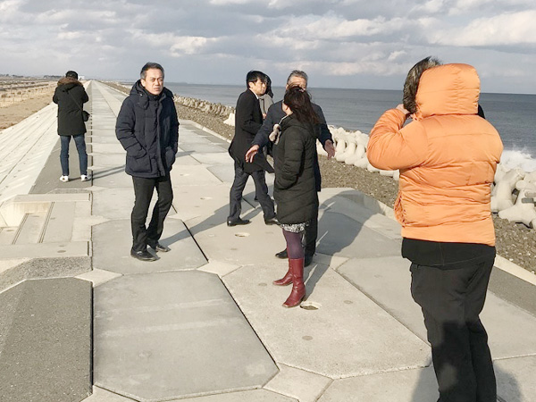 | その後、被災地見学へお連れし、岩沼市沿岸部の押分地区へ。 海岸沿いに延々と続く防波堤の長さに、皆さん圧倒されていらっしゃいました・・・。 |