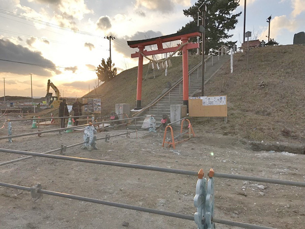 | 続いて、名取市閖上にある「日和山」へ。 当日は復旧工事により、周辺の道路は、至るところ通行止めとなっておりました。 |