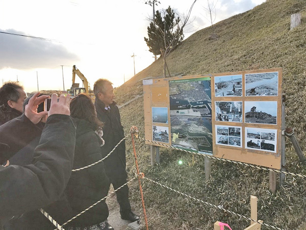 | 続いて、「千年希望の丘」を訪問。 まずはじめに、現在は震災遺構となっている私の実家の蔵へとご案内しました。 皆さん津波の高さを目の当たりにし、驚きを隠せないご様子・・・。 |