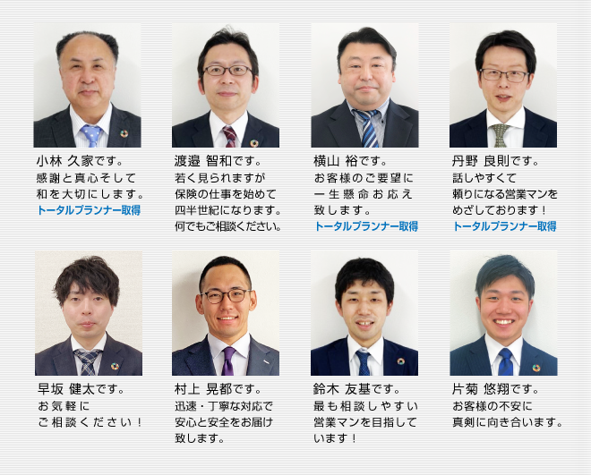 現在、エス・ハートは、社長以下、営業スタッフ9名、内務スタッフ8名(うち損害保険トータルプランナーは11名)で皆様へ安心と安全をお届けしております。日頃、お世話になっております皆様へ、感謝の気持ちを込めまして、ごあいさつをさせていただきます。