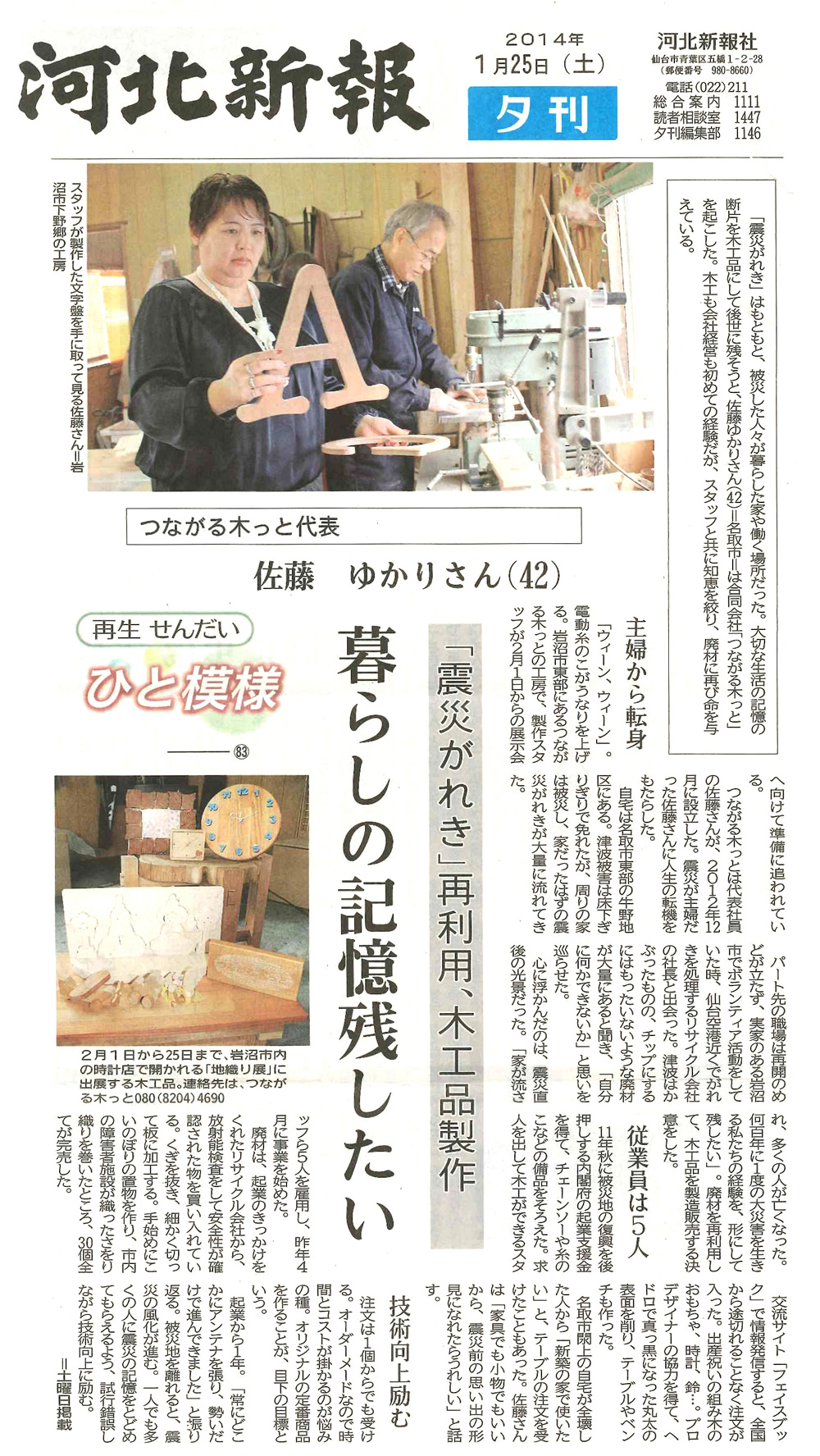つながる木っとは代表社員の佐藤さんが、2012年12月に設立しました。震災が主婦だった佐藤さんに人生の転機をもたらします。