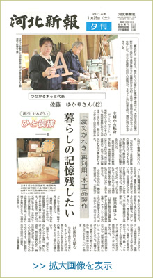震災直後、佐藤さんの勤め先は再開のめどが立たず、実家のある岩沼市でボランティア活動をしていた時、仙台空港近くでがれきを処理するリサイクル会社の社長と出会い、津波はかぶったものの、チップにするにはもったいないような廃材が大量にあると聞き、「自分に何かできないか」「家が流され、多くの人が亡くなった。何百年に1度の大災害を生きる私たちの経験を、形にして残したい」との思いから、廃材を再利用して、木工品を製造販売する決意をしたとの事です。