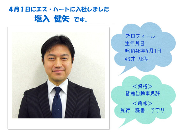 4月1日にエス・ハートに入社しました塩入 健矢です。