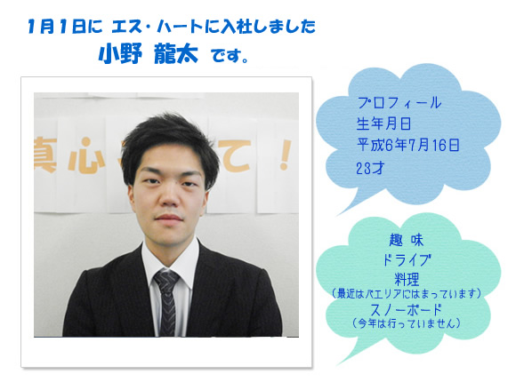 1月1日にエス・ハートに入社いたしました小野 龍太です。