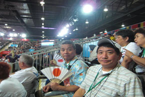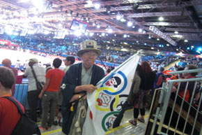 | 会場では、日本でもおなじみのオリンピックおじさんが応援していました。 会場でも超人気者でした。 |
