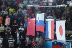 試合場は2面。天井が低く、観客席はとても狭かったです。7月29日は、男子66kg級と女子52kg級の試合でした。 |