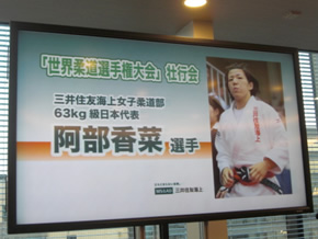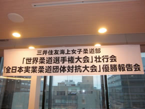8月5日(月)、三井住友海上女子柔道部の「世界柔道選手権大会」の壮行会と、「全日本実業柔道団体対抗大会」の優勝報告会が駿河台新館で行われました。 |