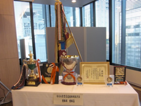 「全日本実業柔道団体対抗大会」の優勝旗、トロフィー、楯、賞状です。 |