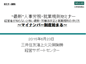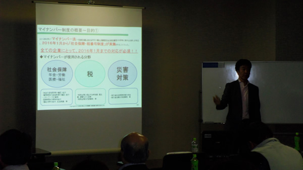 今回は仙台市太白区中央市民センターにて、就業規則・マイナンバー制度をテーマについて、三井住友海上から五十嵐先生を招いて開催しました。 |