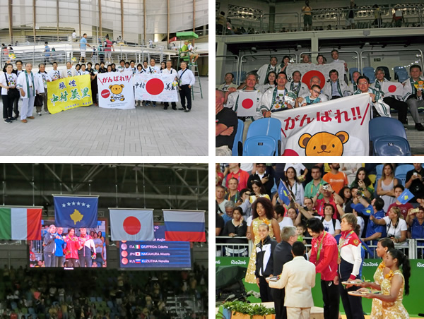 近藤亜美選手の応援団です。結果は準決勝で敗れ3位決定戦でムンフバット選手(世界ランク1位)を残り0秒の有効で破り銅メダルを獲得しました。4年後の東京オリンピックでは金メダルを期待します。 |