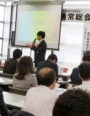 会長である小林社長より、開会の挨拶をさせて頂きました。議事は滞りなく進み、事業計画や役員改選等決定致しました。 総会終了後は、記念講演が開催されました。テーマは「被災地の放課後学校女川向学館の取り組み」です。講師は、認定特定非営利活動法人「カタリバ」の渡邊 洸氏です。 |