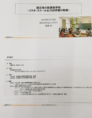 講演の内容は、日本の子供たちの未来の為に今私たちができること。それは、被災地や貧困状態にある子供達の教育支援活動です。 |