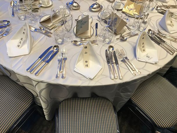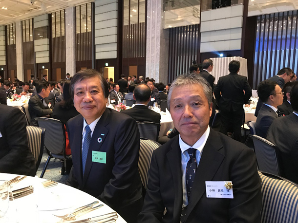 | 私たちエス・ハートの3名は、会場内最前列の、三井住友海上の柄澤会長と、原社長と同じテーブルで、弊社社長の小林は、柄澤会長の隣の席でした。 | |