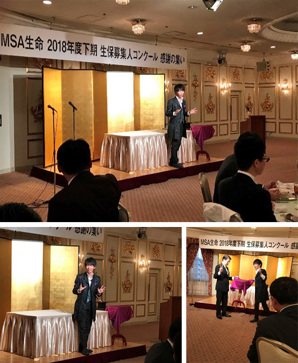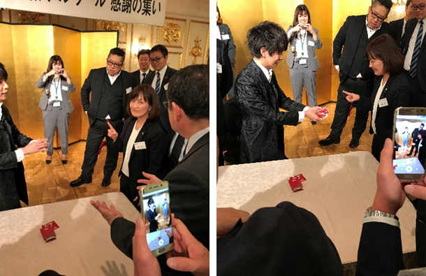 | 素晴らしいショーを見ながらの懇親パーティーはとても楽しく、終わる時間が非常に早いと感じました。 マジックショーと同時に、未練を残しつつ感謝の集いは終了となりました。 来年は、(株)エス・ハートから、より多くのメンバーが出席出来るよう、お客様のお役に立ちながら、精一杯励みたいと思います。 |