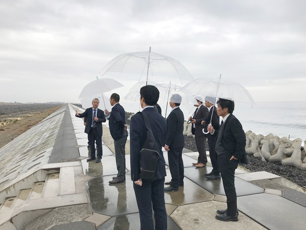 | その後、被災地見学へお連れし、岩沼市沿岸部の押分地区へ。 堤防の上で、当時の状況についてお話しさせて頂きましたが、当日は小雨交じりであいにくの天候であったにもかかわらず、皆さん真剣に聞いていらっしゃいました。 |