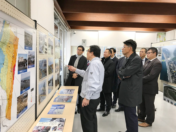 | その後、公園内に併設された「千年希望の丘交流センター」を訪問。 その場に居合わせた同センターの館長に、群馬からはるばる被災地見学に来られた方々である旨お伝えすると、当時の状況や復興の取組みについて、館長より直々にご説明いただきました。 館長、突然の訪問であったにもかかわらず、親切丁寧にご説明下さり、ありがとうございました!! |