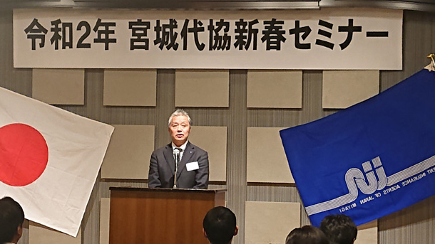 新春セミナーの今回のプログラムは、ご来賓の挨拶、宮城代協活動報告、講演です。 |