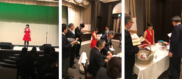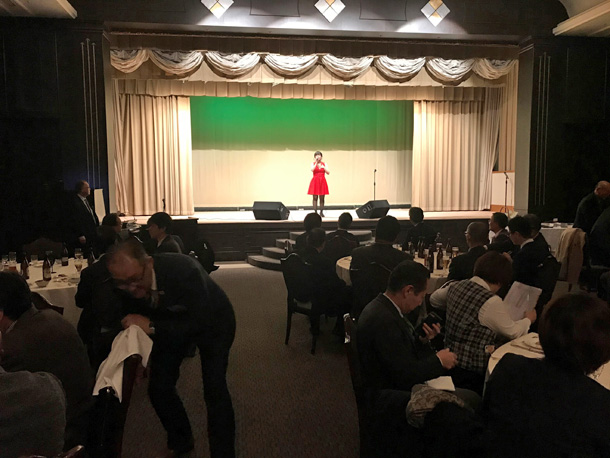 | 懇親会の盛り上がりの中、今年も恒例のゲストが・・・!! 今年は、シンガーソングライターの山田祥子さんのステージです!! |
