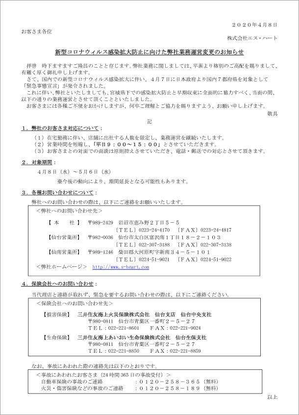 新型コロナウィルス感染拡大防止に向けた弊社業務運営変更のお知らせ