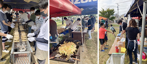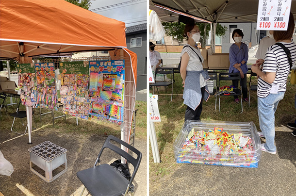| 催し物は子供達に喜んでもらえる事を第1に考えて焼き鳥・焼きそば・フランクフルト・綿あめ・かき氷・くじ引き・駄菓子詰め放題・キッチンカー(たこ焼き・クレープ等)と盛りだくさんのお店が出店しほとんどの店が売り切れ完売御礼となりました。 |
