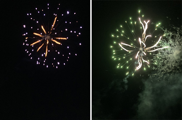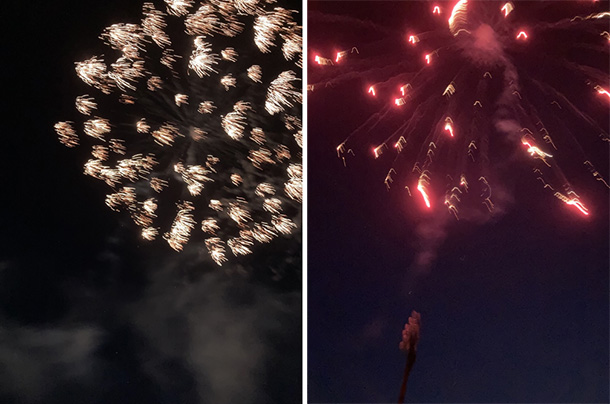 | お祭りのフィナーレは花火会社の社長さんにお願いして2号玉50発・2.5号玉25発を打ち上げました。 お祭りに参加した人はもちろん町内会のみなさんにも間近で見てもらって最高に喜んでいただき最高の笑顔で大満足していただきました。 |