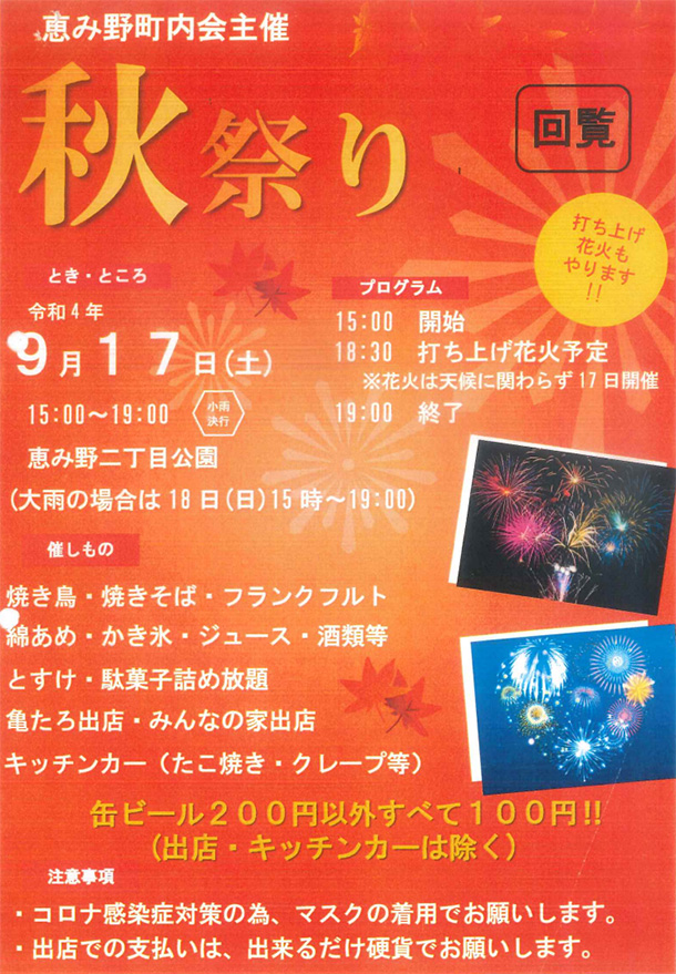 エス・ハート本社のある恵み野町内会(720世帯)で第1回秋まつりが9/17(土)に開催されました。 |
